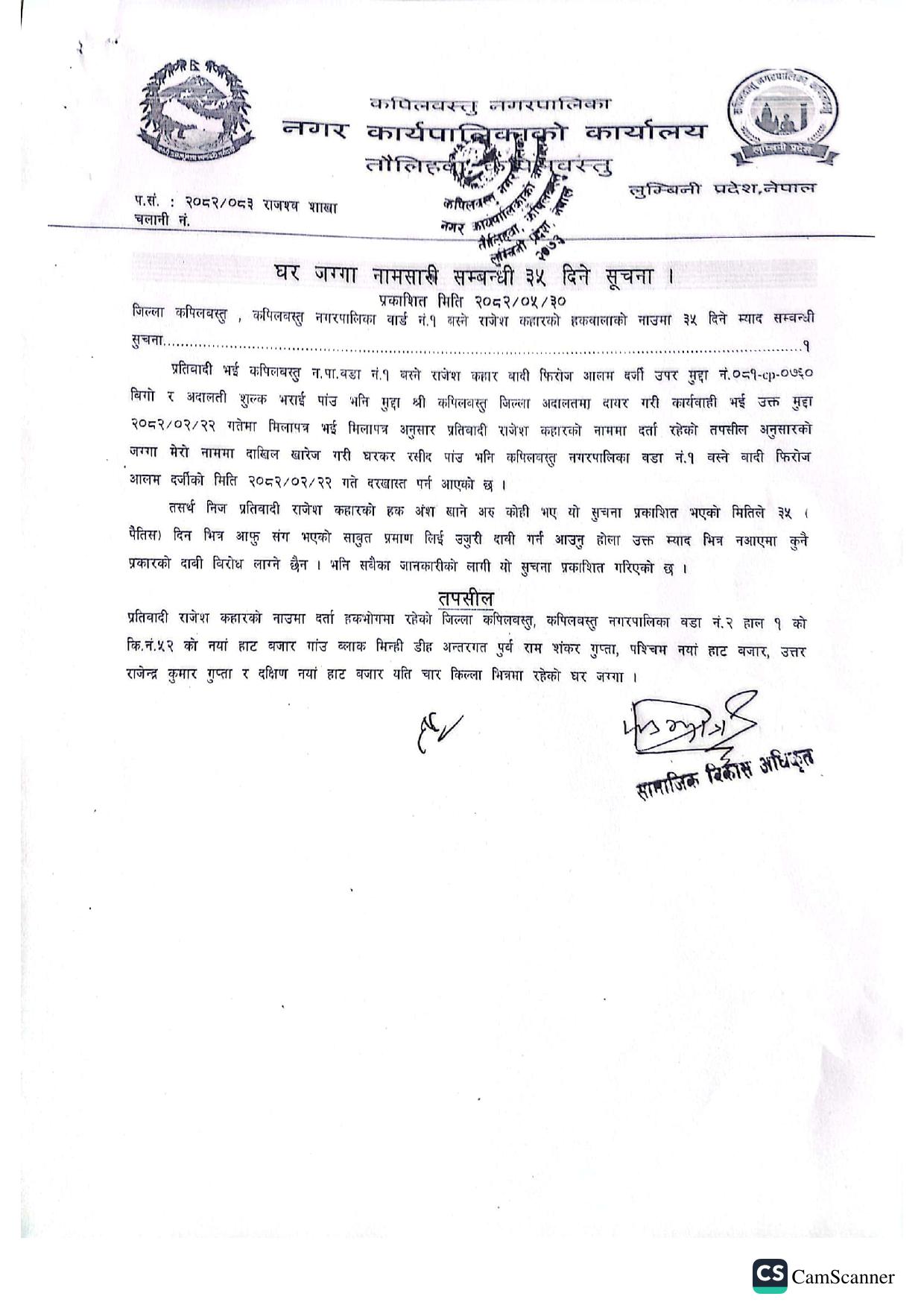 घर जग्गा नामसारी सम्बन्धी ३५ दिने सूचना ।