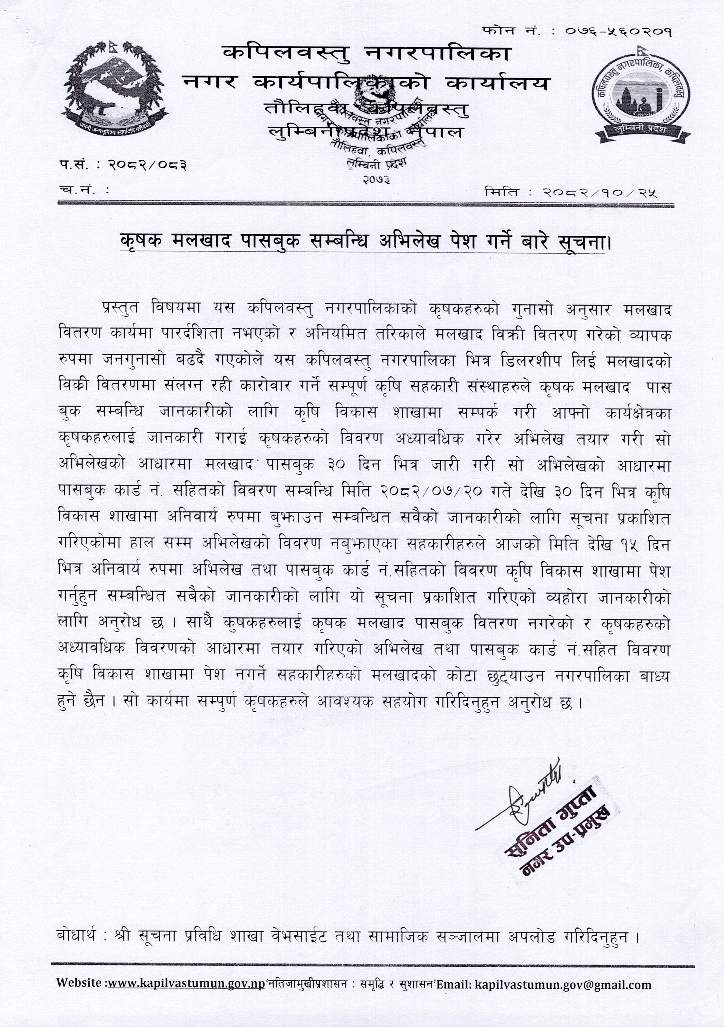 कृषक मलखाद पासबुक सम्बन्धि अभिलेख पेश गर्ने बारे सूचना ।