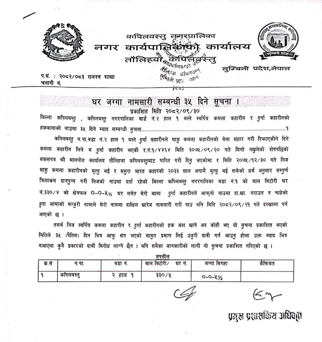 घर जग्गा नामसारी सम्बन्धी ३५ दिने सूचना ।