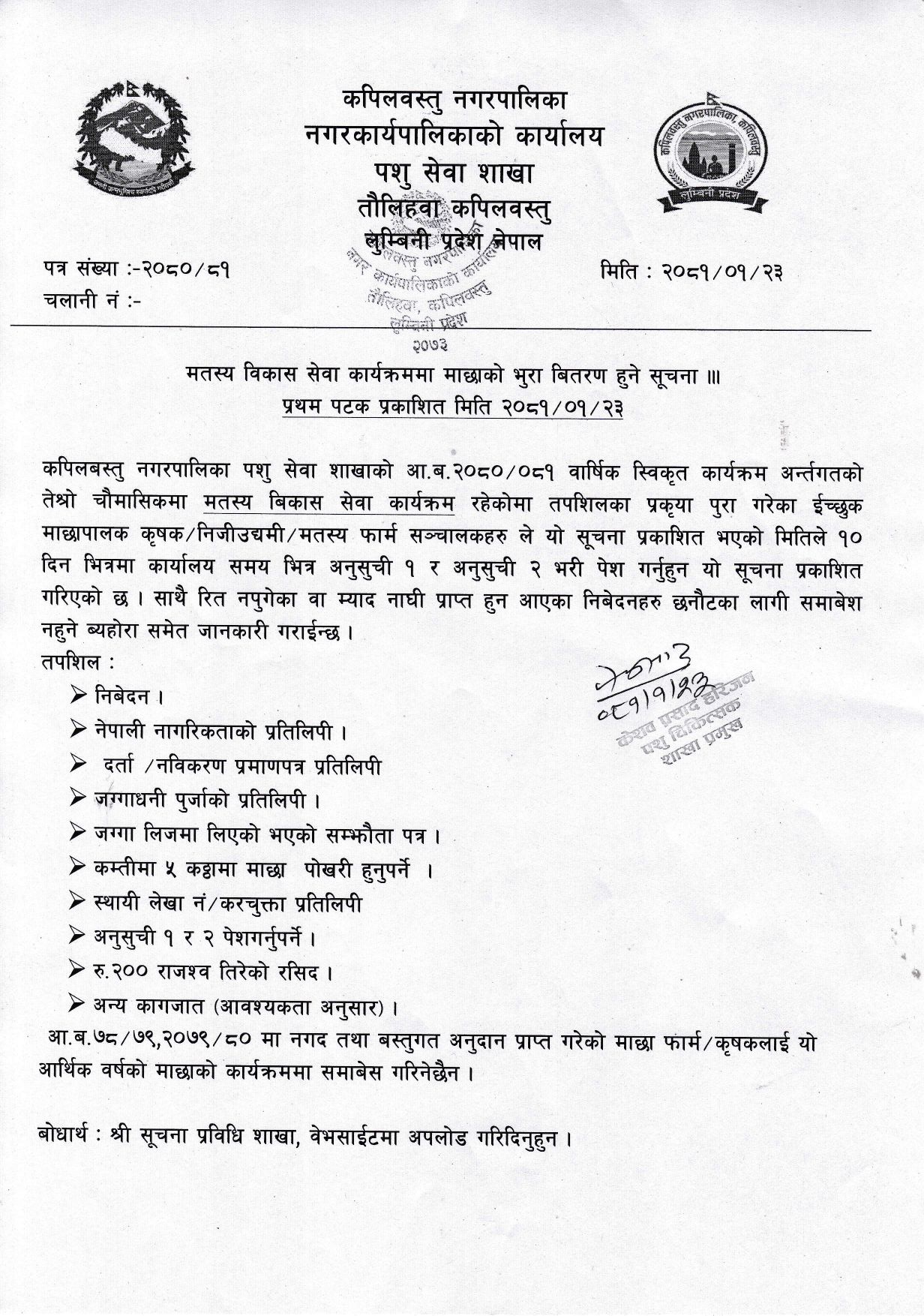 मतस्य विकास सेवा कार्यक्रममा माछाको भुरा वितरण हुने सूचना ।