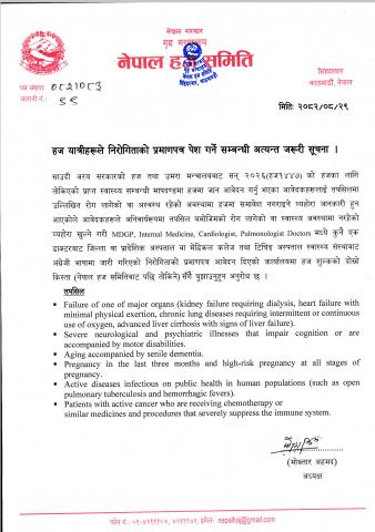 हज यात्रीहरुले निरोगिताको प्रमाणपत्र पेश गर्ने सम्बन्धी अत्यन्त जरुरी सूचना ।
